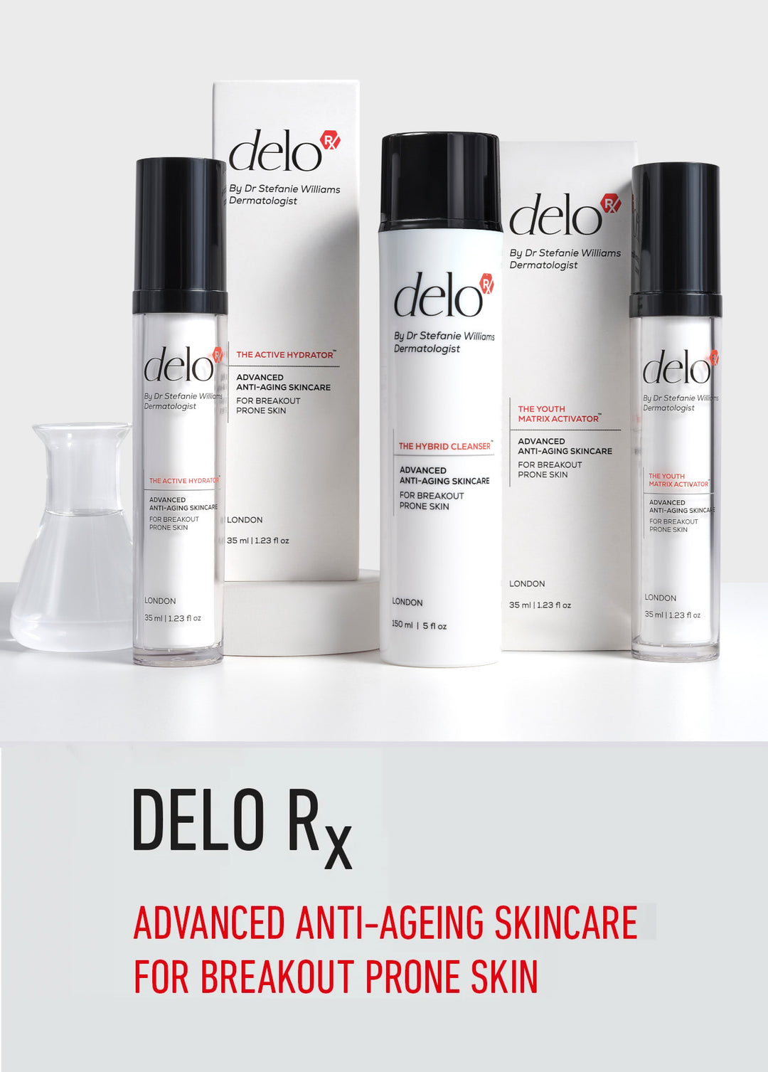 Delo Rx is a revolutionary new skincare brand developed by leading dermatologist Dr Stefanie Williams. It is specially formulated for adult women with more sensitive breakout-prone skin, who want the very best for their skin - preventing and reversing signs of aging, while not triggering breakouts.